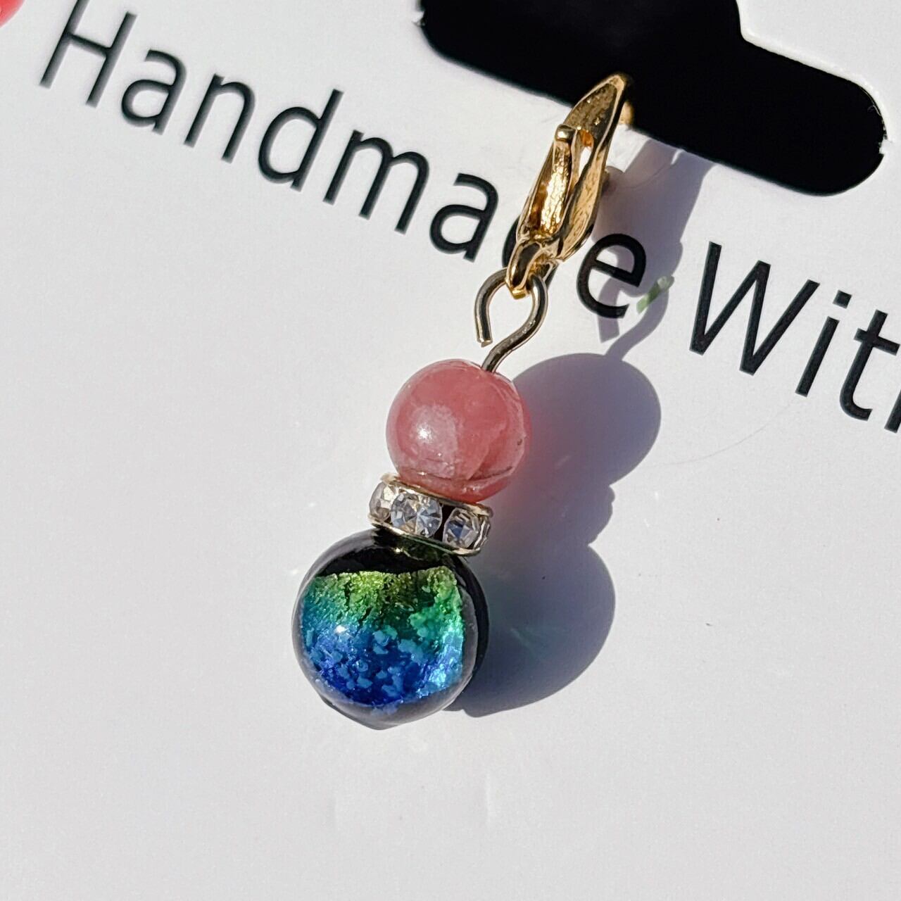 見る角度によって表情が変わるガラスと、優しいピンクの石の組み合わせは、日々を明るく彩ってくれるお守りのような存在です。