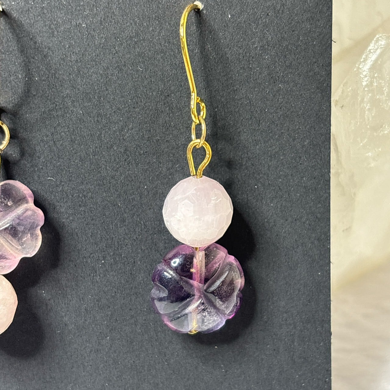 今日は、やさしい透明感が魅力のフローライト(花形)と、ふんわりピンクのローズクォーツを合わせた、可憐な天然石フックピアスのご紹介です。